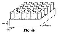 図6a〜6dを参照すると、複数のミクロ構造は、任意の数のパターンに従い、加工表面上に配置されてもよい。加工構造は、平面(図6a〜6dに示されるように)、ほぼ平面、又は図6eに示されるように、異なるトポグラフィー(例えば、起伏)を含んでもよい。より一般には、1つ、2つ、又は3つの寸法で異なるミクロ構造が作製されてもよい。更に、加工構造は、連続的又は非連続的であってもよい。例えば、図6aにおいて、加工構造は、任意の区分のない縦方向690に沿った同一の高さで、フィルムの長さ680に沿って同様に走る連続的構造であってもよい。しかしながら、加工構造の一部分の幅670にわたって、又は第1の寸法にわたって、フィルムは、異なる別個のミクロ構造に区分される。加えて、図6bに示されるように、加工構造は、表面が非連続的加工構造を含むように、2つの方向で異なってもよい。例えば、加工構造は、図6aのように、加工表面の一部分の幅670(すなわち、x軸)に沿って区分されてもよく、加工表面のその部分の長さ680(すなわち、y軸に沿っても区分されてもよい。かかる場合において、別個のポストは、x軸及びy軸の両方に沿って位置付けられる。しかしながら、ここで、構造はすべて、縦方向(又は第3の寸法)690に同一の高さである。更に、図6cに示されるように、構造は、表面の幅及び長さの両方に沿って区分されてもよく、z軸(又は第3の寸法)で表面にわたるミクロ構造の高さにおいても異なってもよい。最後に、加工表面は、上述のパターンのいずれかの規則的及び不規則的加工構造の組み合わせを含む、複数の加工構造形状を含んでもよい。これらの状況のいずれかにおいて、加工構造は、互いに直接隣接してもよく、ほぼ平面である加工表面のいくつかの部分によって離間されてもよい。  With reference to FIGS. 6a-6d, the plurality of microstructures may be arranged on the processing surface according to any number of patterns. The processing structure may include a flat surface (as shown in FIGS. 6a-6d), a generally flat surface, or a different topography (eg, undulation) as shown in FIG. 6e. More generally, different microstructures may be created in one, two, or three dimensions. Furthermore, the processed structure may be continuous or discontinuous. For example, in FIG. 6a, the processed structure may be a continuous structure that runs the same along the