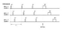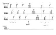 図5は、室外LF送信部4〜6による第1応答要求信号S1の送信パターンの一例を示した図である。たとえば、室外LF送信部4により第1応答要求信号S1が送信されてから、所定の間隔をおいて室外LF送信部5により第1応答要求信号S1が送信され、さらに所定の間隔をおいて室外LF送信部6により第1応答要求信号S1が送信される。室外LF送信部4と室外LF送信部5の信号送信間隔と、室外LF送信部5と室外LF送信部6の信号送信間隔とは、同一であってもよいし、異なっていてもよい。各室外LF送信部4〜6の信号送信周期T1は、同一である。  FIG. 5 is a diagram illustrating an example of a transmission pattern of the first response request signal S1 by the