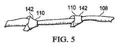 再度、主に図2を参照すると、他の実施形態にも適用可能ではあるが、パッド136は、穿孔されるかまたは部分的にカッティングされて引裂き経路144を形成し、引裂きを容易にし得る。パッド136は、一般にロール上に配置される。引裂き経路144は、縦方向に変位され、かつ幅146にわたって横方向に延在する。引裂き経路144は、隙間のない穿孔すなわち穴から、またはセグメント化された穿孔から、またはわずかな切り込みすなわちキスカット(kiss−cuts)から形成して、引裂き経路を制御し得る。各引裂き経路144の各側に封じ込め接合部148が形成されて、引裂き後も、繊維108を引裂き経路144に沿って一緒に保持し得る。マニホールド部材106は、引裂き経路144に沿って引き裂かれるかまたはカッティング具によってカッティングされない限り、手で分離されないように構成し得る。  Referring again primarily to FIG. 2, although applicable to other embodiments,