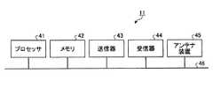 図4は、本発明にかかる基地局11のハードウェア構成の一例を示す図である。基地局11は、例えば、図4に示したプロセッサ41、メモリ42、送信器43、受信器44およびアンテナ装置45により実現される。プロセッサ41は、CPU(Central  Processing  Unit、中央処理装置、処理装置、演算装置、マイクロプロセッサ、マイクロコンピュータ、プロセッサ、DSP(Digital  Signal  Processor)ともいう)、システムLSI(Large  Scale  Integration)などである。メモリ42は、RAM(Random  Access  Memory)、ROM(Read  Only  Memory)、フラッシュメモリー、EPROM(Erasable  Programmable  Read−Only  Memory)、EEPROM(登録商標)(Electrically  Erasable  Programmable  Read−Only  Memory)などの、不揮発性または揮発性の半導体メモリ、磁気ディスク、フレキシブルディスク、光ディスク、コンパクトディスク、ミニディスク、DVD(Digital  Versatile  Disc)などである。  FIG. 4 is a diagram showing an example of a hardware configuration of the