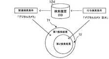 第2検索結果が第1検索結果に含まれる場合がある。例えば、付与検索条件がキーワード「デジタルカメラ」であり、関連検索条件が、キーワード「デジタルカメラ」とカテゴリー「コンパクトデジタルカメラ」との組み合わせであるとする。キーワード「デジタルカメラ」とカテゴリー「コンパクトデジタルカメラ」との組み合わせに対応する第2検索結果は、キーワード「デジタルカメラ」に対応する第1検索結果に含まれる。生成部144は、例えば第1検索結果と第2検索結果とのそれぞれから、比較のために用いる検索結果を抽出してもよい。第1検索結果から比較用に抽出される検索結果を第1比較検索結果という。第2検索結果から比較用に抽出される検索結果を第2比較検索結果という。生成部144は、第2比較検索結果に含まれる検索結果のうち、第1比較検索結果に含まれない検索結果を、特徴検索結果として抽出してもよい。なお、第2検索結果が、第1検索結果と重複しない検索結果を含む場合、生成部144は、第1検索結果と重複しない検索結果を、特徴検索結果として抽出してもよい。  The second search result may be included in the first search result. For example, it is assumed that the assigned search condition is the keyword “digital camera” and the related search condition is a combination of the keyword “digital camera” and the category “compact digital camera”. The second search result corresponding to the combination of the keyword “digital camera” and the category “compact digital camera” is included in the first search result corresponding to the keyword “digital camera”. For example, the