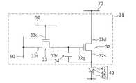 薄膜トランジスタ33は、ゲート配線50に接続されるゲート電極33gと、ソース配線60に接続されるソース電極33sと、キャパシタ34の一端及び薄膜トランジスタ32のゲート電極32gに接続されるドレイン電極33dと、半導体膜(図示せず)とを備える。薄膜トランジスタ33は、接続されたゲート配線50及びソース配線60に所定の電圧が印加されると、当該ソース配線60に印加された電圧がデータ電圧としてキャパシタ34に保存される。  The