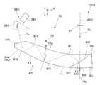 図8を参照して、各表示装置100B,100Aを構成する投射透視装置70等の機能、動作等の詳細について説明する。投射透視装置70のうち、導光部20の一部であるプリズム10は、平面視において顔面に沿うように湾曲した円弧状の部材である。プリズム10のうち、第1プリズム部分11は、鼻に近い中央側つまり光射出側に配置され、光学的な機能を有する側面として、第1面S11と、第2面S12と、第3面S13とを有し、第2プリズム部分12は、鼻から離れた周辺側つまり光入射側に配置され、光学的な機能を有する側面として、第4面S14と、第5面S15と、第6面S16とを有する。このうち、第1面S11と第4面S14とが隣接し、第3面S13と第5面S15とが隣接し、第1面S11と第3面S13との間に第2面S12が配置され、第4面S14と第5面S15との間に第6面S16が配置されている。  With reference to FIG. 8, details of functions, operations, and the like of the projection see-through