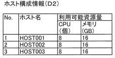 図5には示さないが、ホスト構成情報D2はさらに、各ホストコンピュータについて、稼働状況を表す情報を関連付けてもよい。稼働状況は、利用中資源量と、空き資源量とを含んでもよい。利用中資源量は、たとえば、利用可能な資源のうち、仮想コンピュータが実際に使用している資源の量(本発明に従って配分すると決定した資源量と一致する必要はない)を表す。空き資源量は、たとえば、利用可能資源量から利用中資源量を減算した値を表す。 Although not shown in FIG. 5, the host configuration information D <b> 2 may further associate information representing the operating status for each host computer. The operating status may include an in-use resource amount and an available resource amount. The resource amount in use represents, for example, the amount of resources actually used by the virtual computer among the available resources (it is not necessary to match the resource amount determined to be allocated according to the present invention). The free resource amount represents, for example, a value obtained by subtracting the in-use resource amount from the available resource amount.