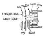 そこで、本形態では、図52、図53に示すように、凹部635AaとIDチップ535とが接触する部位に弾性体500を設けることにより、XZ方向への移動を許容しながらもIDチップ535を凹部635Aaにおける位置を常に保持することにより、位置決めピン573e23と接触する際のIDチップ535の移動量を小さくしている。  Therefore, in this embodiment, as shown in FIGS. 52 and 53, by providing theelastic body 500 at a portion where the recess 635Aa and theID chip 535 are in contact, theID chip 535 is allowed to move while being allowed to move in the XZ direction. By always holding the position in the recess 635Aa, the amount of movement of theID chip 535 when contacting the positioning pin 573e23 is reduced.