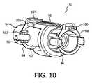 富化アダプタ80は、筐体部材84によって囲まれた中央アダプタアセンブリ82を含む。図9は、一実施例に従った中央アダプタアセンブリ82の前面側等角図であり、図10は、一実施例に従った中央アダプタアセンブリ82の背面側等角図である。図9及び図10に見られるように、中央アダプタアセンブリ82は、第1の端部84と、第2の端部86と、ワイヤハーネスアセンブリ98とを含む。第2の端部86は、構造において、加熱管アセンブリ22の近接端部36と類似しており、出力ポート26のスロット部材33と一致するように構成された管状ポート部材88(図示された実施形態では、標準的なメス型等円すいフィッティング)とタブ部材89とを含む。図9及び図10に見られるように、また、以下より詳細に説明されるように、第2の端部86は、第2の端部が、圧力生成装置4の出力ポート26に、滑らかに、且つ、電気的に結合されることを可能とするために、ワイヤハーネスアセンブリ98の第1の電気コネクタ100を保持するように構成される。第1の端部84は、図示される実施形態では、標準的なオス型等円すいフィッティングである管状ポート部材94を有する結合部材92と、酸素などの追加的な気体が患者インタフェース装置8のフロー経路へ導入されるように、結合部材92によって規定される内部チャンバへのアクセスを与える気体注入ポート96と、ワイヤハーネスアセンブリ98の第2のコネクタ部材104を受けるとともに保持するためのコネクタ筐体102と、加熱管アセンブリのタブ部材53と一致するように構成されるスロット部材103とを含む。このため、第1の端部84は、加熱管アセンブリ22の近接端部36に滑らかに且つ電気的に結合されるように構成される。図示される実施例における第2の端部86は、圧力生成装置4が動作していない場合に圧力生成装置4の中へ追加的な気体が逆流するのを防止するように構成された逆流防止圧力バルブ106を更に含む。  Enriched