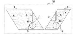 次いで作業者は、表示装置59に表示された第1断層画像8及び第2断層画像9を視認しながら、超音波プローブ3の位置を調整する。具体的には、第1断層画像8上に対象部位5の断面が表示されるとともに第1のガイドライン65が当該対象部位5の略中心に位置するように、超音波プローブ3の第1リニア振動子アレイ23を位置合わせする。さらに、第2断層画像9上に対象部位5の断面が表示されるとともに第2のガイドライン66が当該対象部位5の略中心に位置するように、超音波プローブ3の第2リニア振動子アレイ24を位置合わせする。  Next, the operator adjusts the position of the
