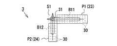 ・上記実施形態では、プローブ本体12の底面20上にて第1リニア振動子アレイ23と第2リニア振動子アレイ24とを略L字状に配置することで、これらを互いに直交させていたが、これに限定されない。例えば、図14に示される別の実施形態の超音波プローブ3Bのように、第1リニア振動子アレイ23及び第2リニア振動子アレイ24を若干ずらして略T字状に配置することで、これらを互いに直交させることもできる。あるいは、図15に示される別の実施形態の超音波プローブ3Cのように、第1リニア振動子アレイ23及び第2リニア振動子アレイ24を略ロ字状に配置することで、これらを互いに直交させることもできる。なお、図15においては穿刺ポイント31が2箇所に形成されている。  In the above embodiment, the first