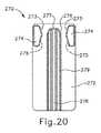 図18〜図20は、本体(272)、中央突起(276)、及び側方突起(274)を備える係止スレッド(270)を示す。図18に示すように、本体(272)は、本体(272)を横断する方向に延在している凹部(271)を備える。凹部(271)は、関節動作ジョイント(211)より近位にある閉鎖管(32)の機構に係合してもよく、閉鎖管(32)の機構が閉鎖トリガー(26)によって遠位及び/又は近位に移動する際、係止スレッド(270)もまた、遠位及び/又は近位に移動する。したがって、閉鎖トリガー(26)がピストル把持部(24)に向かって作動され、エンドエフェクタ(212)を閉鎖する場合、閉鎖管(32)は、遠位に移動し、係止スレッド(270)を移動させてもよい。閉鎖トリガー(26)がピストル把持部(24)から解放され、エンドエフェクタ(212)を開放する場合、閉鎖管(32)は、近位に移動し、係止スレッド(270)を近位に移動させてもよい。係止スレッド(270)を移動させる他の好適な方法は、本明細書の教示を鑑みれば当業者には明らかになるであろう。係止スレッド(270)の中央突起(276)は、本体(272)のほぼ中心から下方に延在する。図20に示すように、中央突起(276)は、遠位壁部(277)及び2つの側壁部(279)を備える。壁部(277)は、本体(272)を横断する方向に延在し、側壁部(279)は、本体(272)の長さに沿って延在する。壁部(277)及び側壁部(279)は、面取りされた引込面(278)によって接合される。中央突起(276)は、一対のスプリング(260)の間を移動するように構成されている。係止スレッド(270)の側方突起(274)は、本体(272)の遠位部分の各側から下方に延在する。図20に示すように、各側方突起(274)は、遠位カム表面(273)及び近位カム表面(275)を備える。カム表面(273、275)は、スプリング(260)の弓状部分(265)に係合するように構成されている。 18-20 show a locking thread (270) comprising a body (272), a central protrusion (276), and a lateral protrusion (274). As shown in FIG. 18, the main body (272) includes a recess (271) that extends in a direction transverse to the main body (272). The recess (271) may engage a mechanism of the closure tube (32) proximal to the articulation joint (211), the mechanism of the closure tube (32) being distal and / or by a closure trigger (26). Or, when moving proximally, the locking sled (270) also moves distally and / or proximally. Thus, when the closure trigger (26) is actuated towards the pistol grip (24) and closes the end effector (212), the closure tube (32) moves distally, causing the locking thread (270) to It may be moved. When the closure trigger (26) is released from the pistol grip (24) and opens the end effector (212), the closure tube (32) moves proximally and the locking sled (270) moves proximally. You may let them. Other suitable methods of moving the locking sled (270) will be apparent to those skilled in the art in view of the teachings herein. The central protrusion (276) of the locking thread (270) extends downward from approximately the center of the body (272). As shown in FIG. 20, the central protrusion (276) comprises a distal wall (277) and two side walls (279). The wall (277) extends in a direction transverse to the body (272), and the side wall (279) extends along the length of the body (272). The wall (277) and the side wall (279) are joined by a chamfered lead-in surface (278). The central protrusion (276) is configured to move between the pair of springs (260). Side projections (274) of locking sled (270) extend downward from each side of the distal portion of body (272). As shown in FIG. 20, each lateral projection (274) includes a distal cam surface (273) and a proximal cam surface (275). The cam surfaces (273, 275) are configured to engage the arcuate portion (265) of the spring (260).