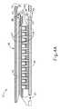 図4A及び図4Bに描写されるように、閉鎖管(32)及び閉鎖用リング(33)を遠位方向に前進させることによってエンドエフェクタ(12)が閉鎖された状態で、発射ビーム(14)は、次いで、上方ピン(38)を長手方向アンビルスロット(42)に入れることによって、アンビル(18)と係合して前進する。プッシャブロック(80)(図5に図示)は、発射ビーム(14)の遠位端に位置し、かつ、発射トリガー(28)が作動した際、発射ビーム(14)がステープルカートリッジ(37)を通って遠位方向に前進するにつれてプッシャブロック(80)が楔形スレッド(41)を遠位方向に押すように、楔形スレッド(41)と係合するように構成されている。かかる発射中に、発射ビーム(14)の切断縁部(48)は、ステープルカートリッジ(37)の垂直スロット(49)に入り、ステープルカートリッジ(37)とアンビル(18)との間にクランプされている組織を切断する。図4A及び図4Bに示すように、中間ピン(46)及びプッシャブロック(80)は共に、ステープルカートリッジ(37)内の垂直スロット(49)内に入ることによって、ステープルカートリッジ(37)を作動させ、楔形スレッド(41)をステープルドライバ(43)との上向きのカム接触へと駆動すると、ステープル(47)は、ステープル開口部(51)を通って外へと駆動され、アンビル(18)の内面のステープル成形ポケット(53)(図3に図示)との成形接触へと駆動される。図4Bは、組織の切断及びステープル留めが完了した後、遠位方向に完全に移動した発射ビーム(14)を示す。ステープル成形ポケット(53)は、図4A及び図4Bの図から意図的に省略されているが、図3に図示されていることを理解されたい。また、アンビル(18)は、図5の図から意図的に省略されていることも理解されたい。 As depicted in FIGS. 4A and 4B, the firing beam (14) with the end effector (12) closed by advancing the closure tube (32) and the closure ring (33) in the distal direction. Is then advanced into engagement with the anvil (18) by placing the upper pin (38) into the longitudinal anvil slot (42). The pusher block (80) (shown in FIG. 5) is located at the distal end of the firing beam (14), and when the firing trigger (28) is activated, the firing beam (14) pushes the staple cartridge (37). The pusher block (80) is configured to engage the wedge-shaped thread (41) so as to push the wedge-shaped thread (41) distally as it advances distally therethrough. During such firing, the cutting edge (48) of the firing beam (14) enters the vertical slot (49) of the staple cartridge (37) and is clamped between the staple cartridge (37) and the anvil (18). Cut the tissue. As shown in FIGS. 4A and 4B, both the intermediate pin (46) and the pusher block (80) actuate the staple cartridge (37) by entering a vertical slot (49) in the staple cartridge (37). When the wedge-shaped thread (41) is driven into upward cam contact with the staple driver (43), the staple (47) is driven out through the staple opening (51) and the inner surface of the anvil (18). Is driven into forming contact with the staple forming pocket (53) (shown in FIG. 3). FIG. 4B shows the firing beam (14) fully moved in the distal direction after tissue cutting and stapling is complete. It should be understood that the staple forming pocket (53) is intentionally omitted from the views of FIGS. 4A and 4B, but is illustrated in FIG. It should also be understood that the anvil (18) is intentionally omitted from the view of FIG.