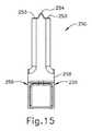 図14及び図15は、係止バー(250)をより詳細に示す。係止バー(250)は、壁部(253)を有する遠位部分(252)と、壁部(253)から遠位に延在している先端(254)と、を備える。先端(254)は、関節動作歯車(280)の歯(282)に対応するように寸法決めされ、先端(254)は、歯(282)の間に嵌合する。係止バー(250)の近位部分(258)は、一対のチャネル(256)を備え、スプリング(260)を収容する。図15に示すように、チャネル(256)は、係止バー(250)の各側に沿って延在し、内側に曲がる。チャネル(256)の内側への曲がりは、スプリング(260)を係止バー(250)内に維持するように構成されている。 14 and 15 show the locking bar (250) in more detail. The locking bar (250) comprises a distal portion (252) having a wall (253) and a tip (254) extending distally from the wall (253). The tip (254) is sized to correspond to the teeth (282) of the articulation gear (280), and the tip (254) fits between the teeth (282). The proximal portion (258) of the locking bar (250) includes a pair of channels (256) and houses the spring (260). As shown in FIG. 15, the channel (256) extends along each side of the locking bar (250) and bends inward. The inward bending of channel (256) is configured to maintain spring (260) within locking bar (250).