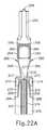 図3は、近位に位置付けられている本発明の例の発射ビーム(14)と、開放位置まで枢動され、下部つかみ具(16)のチャネル内に、未使用のステープルカートリッジ(37)を着脱可能に装着できるようにするアンビル(18)と、を示す。図5及び図6に最もわかりやすく示されるように、この例のステープルカートリッジ(37)は、上部デッキ(72)を提示し、下部カートリッジトレー(74)と連結されている、カートリッジ本体(70)を含む。図3に最もわかりやすく示されるように、垂直スロット(49)は、ステープルカートリッジ(37)の一部を通って形成されている。図3にまた最もわかりやすく示されるように、3列のステープル開口部(51)は、垂直スロット(49)の片側の上部デッキ(72)を通って形成され、垂直スロット(49)の他方の側の上部デッキ(72)を通って、他の1組の3列のステープル開口部(51)が形成される。勿論、任意の他の好適なステープルの列数(例えば、2列、4列、その他の列数)が提供されてもよい。再度、図4A〜図6を参照すると、楔形スレッド(41)及び複数のステープルドライバ(43)は、カートリッジ本体(70)とトレー(74)との間に捕捉されており、楔形スレッド(41)は、ステープルドライバ(43)よりも近位に位置する。楔形スレッド(41)は、ステープルカートリッジ(37)内を長手方向に可動であり、一方、ステープルドライバ(43)は、ステープルカートリッジ(37)内を垂直方向に可動である。ステープル(47)もまた、カートリッジ本体(70)内に、対応するステープルドライバ(43)の上に位置付けられる。特に、それぞれのステープル(47)は、ステープルドライバ(43)によってカートリッジ本体(70)内を垂直方向に駆動され、関連するステープル開口部(51)を通ってステープル(47)を外へと駆動する。図4A、図4B、及び図6に最もわかりやすく示されるように、楔形スレッド(41)は、楔形スレッド(41)がステープルカートリッジ(37)を通って遠位方向に駆動されるにつれてステープルドライバ(43)を上方に促す、傾斜したカム表面を提示する。 FIG. 3 shows an example firing beam (14) positioned proximally and an unused staple cartridge (37) pivoted to the open position and into the channel of the lower grip (16). An anvil (18) is shown that allows it to be detachably mounted. As best shown in FIGS. 5 and 6, the staple cartridge (37) of this example presents an upper deck (72) and is connected to a lower cartridge tray (74), the cartridge body (70). including. As best seen in FIG. 3, the vertical slot (49) is formed through a portion of the staple cartridge (37). As also best seen in FIG. 3, three rows of staple openings (51) are formed through the upper deck (72) on one side of the vertical slot (49) and the other of the vertical slots (49). Through the upper deck (72) on the side, another set of three rows of staple openings (51) is formed. Of course, any other suitable number of staple rows (eg, two, four, other numbers of rows) may be provided. Referring again to FIGS. 4A-6, the wedge-shaped thread (41) and the plurality of staple drivers (43) are captured between the cartridge body (70) and the tray (74), and the wedge-shaped thread (41). Is located more proximal than the staple driver (43). The wedge thread (41) is movable longitudinally within the staple cartridge (37), while the staple driver (43) is movable vertically within the staple cartridge (37). Staples (47) are also positioned in the cartridge body (70) over corresponding staple drivers (43). In particular, each staple (47) is driven vertically in the cartridge body (70) by a staple driver (43) and drives the staple (47) out through the associated staple opening (51). . As best shown in FIGS. 4A, 4B, and 6, the wedge-shaped thread (41) is a staple driver (as the wedge-shaped thread (41) is driven distally through the staple cartridge (37)). 43) presents an inclined cam surface that urges upward.