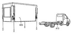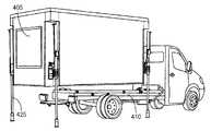図4Lにおいて、別の場所に輸送し又は再設置するために、コンテナ405はトレーラ410に積載されるか再積載される必要がある。しかして、トレーラ410は、調査地点に設置されているコンテナ405の下に位置するように操縦される。必要であれば、脚部425を鉛直方向に延ばすことで、コンテナ405の高さを調整し、トレーラ410が何ら妨げられることなくコンテナ405の下側に位置できるように操縦される。トレーラ410をコンテナ405の下側に位置させるために輸送車両を背走中に、コンテナ405の下側にトレーラ410を安全に位置させるため、また輸送車両がコンテナに間違って衝突するのを避けるために、複数の予防手段が設けられる。例えば以下の例がある。(a)輸送車両にリヤビューカメラを設ける、(b)運転室の後ろに金属製のバッファを設けて、運転手が位置を知るようにする、(c)コンテナ405(背走する輸送車両に面するコンテナ405の壁)に、位置センサを設ける。この場合、トレーラ410にコンテナ405を再積載するための正しい位置の近くに輸送車両が近づいたときに、位置センサが作動する。  In FIG. 4L, the