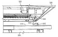 X線検査システムを内蔵するコンテナが、輸送中にトレーラのシャーシ上に安全に積載されるようにし、またシャーシにコンテナが積載された状態で対象物のスキャンをできるようにするために、トレーラのシャーシには適切な装備が設けられている。ある実施の形態では、図5Aに示されるように、トレーラのシャーシ505には、シャーシの前端部と後端部に設けられた一対のコンテナ載置ブラケット510と、それぞれがシャーシ505の角部に位置する4個のV字形状のコンテナ位置決め板515を有する。図5Bに示されるように、4個の位置決め板515とそれらに対応する(コンテナ525の台座に設けられている)ローラ520とにより、コンテナ525がシャーシ505上に向かって下降たときに、コンテナ525が前後の載置ブラケット510と整合する位置になるようにしている。ある実施の形態では、コンテナ525がシャーシ505上に積載された後に、4本の脚部530が機内方向に移動して収容位置に位置し、4本の脚部アセンブリ530のそれぞれに位置する角付き板535によって脚部が所定の位置に保持される。それぞれの脚部530の機内側端部にある角付き板535は、載置ブラケット510の側方のそれぞれにあるクレードル内に位置し、コンテナ525がシャーシ上505で積載されている状態を確保する。  To ensure that the container containing the X-ray inspection system is safely loaded onto the trailer chassis during transport and to allow the object to be scanned with the container loaded on the chassis. The chassis is equipped with appropriate equipment. In one embodiment, as shown in FIG. 5A, the