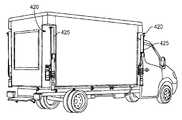 図4Aは、コンテナ405に収容され、輸送車両415のトレイラ部410に載せられた本明細書によるX線検査システムを示す。ある実施の形態では、輸送車両415はトラックであり、通常の速度で平面道路上や高速道路上を輸送するのに適している。本発明の実施の形態によれば、コンテナ405は4つの鉛直壁面406を有し、実質的に四角の箱体を形成している。更に、コンテナ405は、4つの角部のそれぞれに鉛直方向に延びる凹部420を有し、計4つの凹部420を有する。積載位置にあるときに、それぞれの脚部425は、それぞれの鉛直凹部420に収容され、収容状態では脚部はコンテナ405の鉛直壁面406と面一かまたは壁面よりも内方に凹部内に沈んで位置する。  FIG. 4A shows an X-ray inspection system according to this specification housed in a