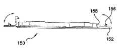 図11及び図12では、リテーナ150は、リテーナをキャップ54(図1及び図2)に解除自在に結合する1つ又は2つ以上のラッチ152を有する。一形態では、複数のラッチ152が、リテーナ150の周囲に沿って間隔を置いて設けられている。ラッチ152は、リテーナ150にヒンジ止めされ又は回動自在に結合され、これらラッチは、リテーナの周囲に沿って互いに間隔を置いて設けられている。一形態では、ラッチは各々、一体ヒンジでリテーナ150に結合されている。第1の位置では、ラッチ152は、リテーナと実質的に同一平面内に位置する関係をなしてリテーナ150の周囲から側方に延びている。各ラッチ152は、ラッチから実質的に垂直に延びる突起156を有している。キャップ54をリテーナ150上に置き又は嵌めた後且つ(或いは)これらを逆の関係にした後、ラッチ152を作動させてキャップとリテーナを互いに結合する。具体的に説明すると、ラッチ152をキャップに向かって第2の位置まで回転させ、この第2の位置では、ラッチは、リテーナをキャップに結合するためにキャップ54の一部分又は縁部に係合する。一形態では、キャップ54の係合部分は、ラッチ152の突起をキャップに固定する開口部、孔、切欠き、段部、突起又は他のこれらに類似した形式の受け具又は係合方式である。  11 and 12, the