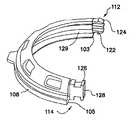 第1の弧状体108と第2の弧状体110を互いに隣接して配置して第1の弧状体の第1の端103が第2の弧状体の第2の端105と対応し、第1の弧状体の第2の端105が第2の弧状体の第1の端103と対応するようになっているが、互いにスナップ嵌めされる前の状態において、これら弧状体は、リテーナ52(図1)をこれら2つの弧状体相互間に配置できるよう第1の大きな周囲を構成する。棘付き部分112は、対応の受け具114と嵌合し、これら2つの弧状体を互いに結合する。各棘付き部分は、複数本の弾性アーム122を有し、これら弾性アームのうちの2つからは突起124が延びている。各受け具114は、棘付き部分からの突起124に係合する対応の側壁126を有し、それにより、アーム122は、アームが受け具により構成されたチャネル128内に滑り込むと、互いに向かって撓む。突起124が側壁126の端を通過すると、アーム122は、互いから遠ざかるよう撓むことができる。突起124の縁部と側壁126の端の縁部の係合又は接触により、アーム108,110は、互いに離脱するのが阻止される。2つの弧状体108,110を互いに結合することにより、画定される周囲は、リテーナ52(図1)を捕捉し又は保持するよう第2の小さな周囲に減少する。アーム122を互いに向かって撓ませることにより、棘付き部分112は、対応の受け具114の側壁から離脱して受け具から滑り出ることができ、それにより、弧状体108,110は、リテーナ52(図1)から分離して離脱することができる。  The first