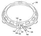 図8〜図10を参照すると、キャップ100,130は、キャップを環状周囲に沿って少なくとも1つの隙間101,132を有している。少なくとも1つの隙間101,132は、キャップ100,130の少なくとも1つの第1の端103,134及び少なくとも1つの第2の端105,138を形成している。隙間101,132は、第1の大きな周囲から第2の小さな周囲へのキャップ中の移行を容易にする。以下に詳細に説明するように、キャップ100,130は、キャップを第2の小さな周囲に維持する手段を有する。キャップ100,130を第1の大きな周囲に設定する場合、リテーナ52(図1)をキャップの開口部内に挿入し又はこれから取り出すのが良い。リテーナ52(図1)は、リテーナがキャップの開口部内に位置決めされている状態でキャップの周囲を第2の小さな周囲に移行させ、キャップの周囲を維持手段によって第2の小さな周囲に維持することによりキャップ100,130にしっかりと結合できる。  8-10, the