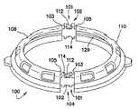 図示していないが、キャップ100とリテーナ52(図1)の相互結合を助け又はキャップ及び(又は)リテーナの他の寸法形状の採用を可能にするよう各弧状体内に追加の棘付き部分と受け具のスナップ嵌合部を設けるのが良い。一形態では、キャップ100は、単一の隙間101を有し、この場合、単一の棘付き部分112及び単一の受け入れ部分114が設けられる。一形態では、単一の棘付き部分112及び単一の受け入れ部分114を備えたキャップ100は、弧状体の別の部分に設けられたヒンジ又はピボットを備えるのが良い。  Although not shown, additional barbed portions and receptacles are provided within each arcuate body to assist in the mutual coupling of the