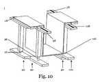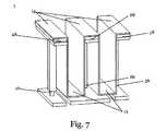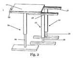 図7及び図8は輸送装置1の第3実施態様の立体図を示すもので、荷運搬体10におけるアクチュエータ支持部14の間に配置された2つの低い部分(低下部)12を示している。当該輸送装置1の幾つかの用途例に対しては、全体の重心を可能な限り低く配置することが望ましい。例えば輸送装置1により人が運ばれねばならない場合、該人は足を上記2つの低下部12に位置させることができる。  FIGS. 7 and 8 show a three-dimensional view of the third embodiment of the