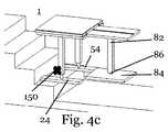 図4cは次のフェーズを示し、該フェーズにおいては中央歩行エレメント80の垂直アクチュエータ86が、該中央歩行エレメント80の地面接触部84が上昇されるように駆動される。この位置において、重心の投影150は、地面接触部24,54のうちの対応する階段の踏み段に接触する部分の間に安定して位置され、従って荷を含む当該輸送装置1全体は安定である。  FIG. 4c shows the next phase, in which the