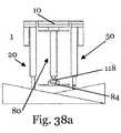図38a〜42bは輸送装置1の第13実施態様により非平坦な地面を乗り越える方法の好ましい実施態様を時間順序図で示すもので、時間順序は図番38,39,40,…により決定され、同じ図番の“a”及び“b”は同一のフェーズであるが異なる視点からのものを示す。輸送装置1の第13実施態様は中央歩行エレメント80の前側垂直アクチュエータ122と後側垂直アクチュエータ126との間にヒンジ118を有し、該ヒンジ118の回転軸は当該輸送装置1の前後移動方向と平行である。このヒンジ118を使用することにより、中央地面接触部84を当該輸送装置1の前後移動方向と直交する方向における地面の向き(orientation)に適合(順応)させることができる。  38a-42b show in a time sequence diagram a preferred embodiment of the method of overcoming a non-planar ground according to a thirteenth embodiment of the
