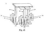 図18は輸送装置1の上記第7実施態様の立体正面図を示すもので、該輸送装置1が上昇された位置において3つの全ての地面接触部24,54,84で立ち、歩行エレメント20,50,80が横方向に僅かに延長されていることを示している。  FIG. 18 shows a three-dimensional front view of the seventh embodiment of the