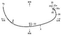 また、図7に示すように、ハウジング4の左側は、車両用ドアミラー1の左側面に回り込むように湾曲形成された湾曲壁部36を有している。湾曲壁部36は、その先端側(後側)に行くほど右側に位置するように形成されており、従って、湾曲壁部36の先端部36aは、湾曲壁部36の基端側(前側)よりも右側に位置することになる。  Further, as shown in FIG. 7, the left side of the