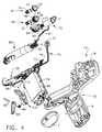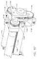 図2〜5を参照すると、一形態において、モータ80はモータ出力シャフト81を含み、モータ出力シャフト81は、モータ出力シャフト81に回転不能に取り付けられたモータ駆動ギヤ82を有している。モータ駆動ギヤ82は、以下で更に詳細に議論するように、噛み合う「動作可能な」係合を伝達組立体60となすように構成されている。少なくとも1つの形態において、伝達組立体60は伝達キャリッジ62を含み、伝達キャリッジ62は、駆動ギヤ82と第2の回転駆動シャフト42上のギヤ44及び46との間を軸方向に移動するように支持されている。例えば、伝達キャリッジ62は、支持シャフト63上にスライド可能に支承されてもよく、支持シャフト63は、伝達キャリッジの作用線が回転駆動システムのギヤトレーンに対して垂直となるように、ハウジング12内でシャフトマウント61上に装着される。シャフトマウント61は、ハウジング10内のスロット又は他の機構内に強固に支持されるように構成されている。伝達キャリッジ62は、支持シャフト63上に回転可能に支持されるキャリッジギヤ64を含み、駆動ギヤ82とは駆動係合をなす一方で、ギヤ44及び46とは選択的に噛み合い係合をなすように構成されている。図2〜5に示す装置構成において、伝達キャリッジ62は、シフタ、つまり「シフトさせるための手段」70に動作可能に取り付けられており、このシフトさせるための手段70は、「第1の駆動位置」と「第2の駆動位置」との間で伝達キャリッジ62を軸方向にシフトさせるように構成されている。一形態において、例えば、シフトさせるための手段70は、ハンドル14のハウジング12内に支持されるシフタソレノイド71を含んでいる。シフタソレノイド71は、双安定ソレノイドを含んでもよく、又は例えば、「二段配置ばね荷重式」ソレノイドを含んでもよい。図示の装置構成は、例えば、伝達キャリッジ62を第1の駆動位置へと遠位方向「DD」に付勢するばね72を含んでおり、キャリッジギヤ64は、中間駆動ギヤ46と噛み合い係合をなす一方で、駆動ギヤ82とも噛み合い係合をなす。第1の駆動位置にあるとき、モータ80が作動することにより、結果として、ギヤ82、46及び24が回転することになり、これによって最終的に、第1の駆動シャフト22が回転することになる。本明細書で更に議論するように、シフタソレノイド71は発射トリガ90によって作動されてもよく、発射トリガ90は、図2及び5に示すように、ハンドル14のハウジング12上に旋回式で支持されている。図示の実施形態において、発射トリガ90は、ハンドル14内に装着された発射トリガシャフト92上に旋回式で支持されている。発射トリガ90は通常、非作動位置において発射トリガばね94によって付勢されている。図3を参照されたい。発射トリガ90は、発射スイッチ96を動作可能に作動させるように装着されており、発射スイッチ96は、制御回路基板組立体100上に動作可能に支持されている。図示の装置構成において、発射トリガ90が作動することにより、結果としてシフタソレノイド71が作動する。図61、63、64に関連して本明細書で以下に更に詳細に記述するように、ハンドル用プロセッサ7024は、駆動信号をシフタソレノイド7032(71)に与える。ここで再び図2〜5を参照するが、このように、発射トリガ90が作動する結果として、シフタソレノイド71が伝達キャリッジ62を近位方向「PD」に引っ張り、それによって、キャリッジギヤ64を移動させて第2の駆動ギヤ44と噛み合い係合させることになる。図7を参照されたい。キャリッジギヤ64が駆動ギヤ82及び第2の駆動ギヤ44と噛み合い係合をなしているときにモータ80が作動することにより、結果として、第2の駆動シャフト42が第2の駆動シャフト軸「SDA」を中心として回転することになる。また図2〜5で分かるように、シフト式伝達組立体60はまた表示システム74を含んでもよく、表示システム74は、制御基板100並びに伝達表示灯77に動作可能に結合された一対のスイッチ75及び76を含んでいる。スイッチ75、76は伝達キャリッジ62の位置を検出するように働き、その結果、制御システムは、伝達キャリッジ62の位置に応じて表示灯77を作動させることになる。例えば、表示灯77は、伝達キャリッジ62が第1の駆動位置にあるときに付勢されてもよい。これにより、モータ80が作動する結果として第1の駆動システム20が作動する指示が、臨床医に示唆される。  2 to 5, in one form, the