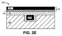 受容側基板201内に、犠牲層206を形成する。犠牲層206は、受容側基板201内に完全に埋め込むことができる。受容側基板201を透視した図2B−2の上面図に示すように、犠牲層206は、第2の接着層104B内でキャリア基板102の一部分に沿って延在し得る。図2B−1に示す実施形態を再び参照して、犠牲層206は、キャリア基板102のトレンチ内に形成されて、第2の接着層104Bによって完全に取り囲まれる。第2の接着層104Bは、キャリア基板102のトレンチ内の犠牲層206を直接取り囲むことができる。いくつかの実施形態において、犠牲層206は、接着層104Bから選択的に除去することが可能な犠牲材料で形成される。また、犠牲層206は、接着層104B内に拡散しない犠牲材料で形成される。犠牲層206は、さらに、マルチゲートHEMTのその他のフィーチャを形成するために用いられる後続の処理条件に耐えるものであり得る。一実施形態では、犠牲層206は、タングステンなどの金属、または窒化チタン(TiN)もしくは窒化シリコン(SiN)などの窒化物で形成することができる。  A