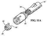 更に、端部リテーナアタッチメント(例えば、プラグ又はクリップ)92が、ランセットキャリアテール部分50のリテーナ突起51と第2のカム部材80との間のテール部分50に配置され、2つの部分間により良好な接続をもたらし得る。一般に、戻しバネ90も、リテーナ92の前の位置でテール部分50に配置される為、端部リテーナアタッチメントもそれをランセットキャリア40に保持する。代替的な実施形態では、配置構成は逆にでき、第2のカム部材の被受け入れ部分は、ランセットキャリアの軸方向穴を通って延在し、及び第2のカム部材のリテーナは、ランセットキャリアからの引き出しを防止する。更に、他の実施形態では、第2のカム部材及びランセットキャリアは、これらを動作可能に一緒に結合して、例えば第2のカム部材が引っ込む最中にランセットキャリアを押すようにして、これらを共に引っ込めるようにする他の従来の構造及び配置構成を含む。  In addition, an end retainer attachment (eg, a plug or clip) 92 is disposed on the