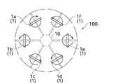 図2に示すように、マルチコプター100が備える6つのプロペラ1の回転方向は、周方向に隣接するプロペラ1同士(例えば、プロペラ1aとプロペラ1b)の回転方向が互いに逆になるように設定されている。これにより、プロペラ1を回転させることにより発生した回転トルクが互いに相殺されるので、マルチコプター100自体がプロペラ1の回転により旋回することなく、上昇力を得て好適に上昇することができる。  As shown in FIG. 2, the rotational directions of the six