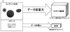 図3に記載の通り、コンテンツの容量のうち、大半を占めるのは映像や音声のコンテンツ本体であり、メタデータの容量はコンテンツ本体の容量よりも遥かに小さい。メタデータをダウンロードするだけならば広帯域のネットワークは不要であり、既存の公衆通信ネットワークで十分である。そのため、利用者は、視聴できるコンテンツのメタデータを公衆通信ネットワークを通じて場所を問わず入手することができる。一方、利用者は、ブロードキャスト型ネットワーク13を介して宅内まで容易にコンテンツをダウンロードできる。この特徴は、大容量のコンテンツを所望する場合に特に有益である。FIG. 3 is a diagram for comparing the capacity of content and metadata.