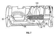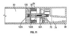 示される例において、電池56及び液体リザーバ60が、ハウジング32内に収容されている。液体リザーバ60は、液体ニコチン製剤などの液体を収容する。ポンプ64は、リザーバ60の後ろに又はリザーバ60内に位置する。このポンプ(例えば、ピストンポンプ又はダイヤフラムポンプ)は、機械的に又は磁気的にポンプモーター80に結合することができる。チェックバルブ82は、ある体積の液体をリザーバ60からポンプ64に流す。液体は、それに続いてヒーター70に送達される。ヒーター70は、ワイヤコイルの形態であってよい。リザーバは、浮遊エンドキャップを有してよい。この浮遊エンドキャップは、移動して、液体が消費されるときに起こるリザーバ内の真空状態を防止する。In the example shown, battery 56 and