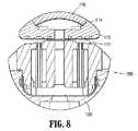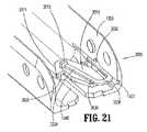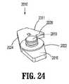 図22および図24を特に参照すると、ラッチ2010は、上部表面2014および下部表面2016を有する本体2012と、下部表面2016から下方に垂れる下部突起2018と、上部表面2014から上方に延びるバネストップ2019と、第1の側方の面2022上の形状付き表面2020とを含む。本体2012は、第2の側方の面2024も有する。形状付き表面2020は、2つの側面を有する。第1の側面2020aは、ラッチ2010が、動的締め付け部材1402の通過を遮るブロッキング位置にあるとき、中央のスロット1340に対して角度をなす。形状付き表面2020の第2の側面2020bは、ラッチがブロッキング位置にあるとき、中央のスロット1340に対して横に延びる(図30を参照)。  With particular reference to FIGS. 22 and 24, the