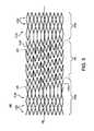 しかしながら、選択された格子の幾何形状及び材質によっては、代替的に、格子がステントの完全な延伸に抵抗しうる。このことは、ステントの寸法を格子状の被覆部に対して大型化することによって達成されうる。ステントは、格子状の被覆部に対して約10%〜約100%、約20%〜約70%、又は30%〜約50%の分量だけ大型化された外径を有しうる。例えば、自己延伸式ステントの外径が約10mmであるとともに、格子の内径が約8mmでありうる。ステントを格子に対して大型化すること(本例においては約20%まで)の効果は、展開されたステントを折り畳もうとする力に抵抗する自己延伸式デバイスが最終的に提供されることである。大型化された自己延伸式ステントが使用される場合は、大型化されていない同一のステントと比較して、展開されたステントの直径を縮小させるのに必要な力の量が大きくなる。 However, depending on the lattice geometry and material chosen, the lattice can alternatively resist full stretching of the stent. This can be achieved by increasing the size of the stent relative to the grid-like covering. The stent may have an outer diameter that is enlarged by an amount of about 10% to about 100%, about 20% to about 70%, or 30% to about 50% with respect to the grid-like covering. For example, the outer diameter of the self-expanding stent can be about 10 mm and the inner diameter of the lattice can be about 8 mm. The effect of upsizing the stent relative to the lattice (up to about 20% in this example) will ultimately provide a self-stretching device that resists the force of folding the deployed stent. It is. When an enlarged self-expanding stent is used, the amount of force required to reduce the diameter of the deployed stent is increased compared to the same non-enlarged stent.