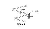 また、図3A及び図3Bには、頂部の幾何形状がさらに示されている。頂部の幾何形状とは、2つ又は3つ以上の支柱115、117、124が交わる箇所における頂部114、116、及び123の形態のことを指す。各支柱及び各頂部は、幅及び厚さ(紙面に向かう方向)からなる断面を有する。頂部の半径、幅、及び厚さ(図4A〜図4C参照)、並びにそれら頂部を形成する支柱の角度によって、頂部の幾何形状が概ね決定される。周方向部材110p又は110dの波状の螺旋周回部112p又は112d、及び螺旋要素120の螺旋周回部121p、121d、122は、概ね均一な頂部の幾何形状を有する。任意に、周方向リング111p又は111dも、周方向部材110p又は110dの波状の螺旋周回部112p又は112d、及び螺旋要素120の螺旋周回部121p、121d、122と同じ頂部の幾何形状を有する。頂部の幾何形状は変更可能であってもよい。例えば、周方向リング111p又は111d、周方向部材110p又は110dの波状の螺旋周回部112p又は112d、及び螺旋要素120の螺旋周回部121p、121d、122の各々は、異なる頂部の幾何形状を有しうる。  3A and 3B further illustrate the top geometry. The top geometry refers to the form of the tops 114, 116, and 123 where two or