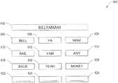 一実施態様では、ユーザインタフェース102は、表示600によって、単音節要素の一部分を呈示するが、他の部分がユーザ選択に関連しない限り又は関連するまで、単音節要素の別の部分を呈示しなくてもよい。例えば、表示600は、最初に、構成要素604「bell」、610「bail」、616「bale」及び622だけを表示してもよい。ユーザがどの構成要素を選択するかにより、ユーザインタフェース102は、表示600によって、他の構成要素606、608、612、614、618、620、624及び626のうちの1つ以上を表示してもよい。例えば、ユーザが、構成要素604「bell」を選択した場合、ユーザインタフェースは、構成要素606「ya」、608「mani」及び620「money」だけを示すが、構成要素614「any」を示さず、その理由は、ユーザインタフェース102及び/又は発音ゲッサー202が、構成要素614が構成要素604「bell」及び/又は構成要素606「ya」に十分に関係があると見なさないからである。  In one implementation, the
