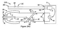 図24Cは、両電力コネクタ52がハンドピース120とジェネレータ8とに接続し、起動回路300がポート160によりジェネレータ8に接続されている、単極構成102にある電気手術デバイス2を示す。起動ボタン302は第2のスイッチ状態312にあり、信号が内部スイッチおよび/またはCPU74へ送信され、それにより電力供給が開始されて電源64から方向320のように流れる。ブレード電極26は進出位置にあり、ブレード電極26のスイッチ60は動作アームに接続されており、ブレード電極26に電力が供給される。他方のスイッチ60は、一方の動作アームから他方の動作アームへ延びており、これにより両動作アームが電気的に接続され、かつ電力がブレード電極26と両動作アーム6との間で移動できる。方向矢印は、図24Bの双極構成と図24Cの単極構成との間のスイッチ60の動きを示す。  FIG. 24C shows the