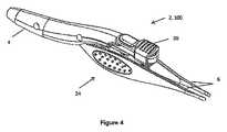 アクティブ部は電力を印加するように機能してもよい。アクティブ部は鉗子の接触領域と同一の部分であってもよい。したがって、例えば、鉗子の接触部間に組織が握持された場合、電力がこの接触部を介して組織に供給されてもよい。動作アームのアクティブ部は2つの対向する動作アーム間にあることが好ましく、ブレード電極のアクティブ部は、動作アームを越えて、またはチャネルから外へ、更には両方によって進出している部分である。アクティブ部は、非アクティブ部または絶縁された部分により実質的に取り囲まれていてもよい。非アクティブ部は、電力を供給しない、または絶縁されている、更には両方である任意の部分であってもよい。非アクティブ部は、偶発的な接触により電力を漏洩する可能性があり、したがって電力の偶発的の漏洩が起こらないようにかつ/または漏洩電流が防止されるように絶縁されている、任意の部分であってもよい。例えば、動作アームの外側は、関心組織の近傍の組織に動作アームが誤って接触した場合に近傍の組織が電流の漏洩に晒されないように、絶縁材料で被覆されていてもよい。非アクティブ部およびアクティブ部は、異なる材料で作製されていてもよく、異なる材料で被覆されていてもよく、または両方であってもよい。 The active part may function to apply power. The active part may be the same part as the contact area of the forceps. Therefore, for example, when the tissue is gripped between the contact portions of the forceps, electric power may be supplied to the tissue through the contact portion. The active part of the working arm is preferably between two opposing working arms, and the active part of the blade electrode is the part that extends beyond the working arm or out of the channel and both. The active part may be substantially surrounded by an inactive part or an insulated part. The inactive part may be any part that does not supply power or is insulated, or even both. An inactive part is any part that is isolated to prevent accidental leakage of power and / or to prevent leakage currents that may leak power due to accidental contact. It may be. For example, the outer side of the working arm may be coated with an insulating material so that if the working arm accidentally contacts tissue in the vicinity of the tissue of interest, the neighboring tissue is not exposed to current leakage. The inactive portion and the active portion may be made of different materials, covered with different materials, or both.