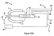 図22A〜図22Cは、ジェネレータ8と電気手術デバイス2との間の種々の回路構成を示す。ジェネレータ8は、ハンドピース120に接続されている中央処理装置を含む。使用者は、双極構成100(図22A)と単極構成102(図22Bおよび図22C)との間で、電気手術デバイス2を変更することができ、双極構成100への構成の変更は、1つのスイッチが開状態62にあり、かつ1つのスイッチ60が閉状態にあるように、スイッチ60を変更する。スイッチ60が閉じられている場合に電力および/または制御信号がダイオード122を通過して電気手術デバイス2を制御するように、回路の各分岐がダイオード122を含む。ジェネレータ8は、接地パッド66、動作アーム6、およびブレード電極26に電気的に接続されている変圧器124をさらに含む。ジャンパ12が接地パッド66を動作アーム6の一方へ電気的に接続する。ジェネレータ8は、電気手術デバイス2から延びておりかつジェネレータ8にプラグが差し込まれている電力コネクタ10を含む。ジェネレータ8は、閉じて接地パッド66と電気的に接続し、開状態62で接地パッドを切り離すスイッチ60を含む。図22Aは、双極構成100にある電気手術デバイス2を示し、変圧器124と動作アーム6の各々との間で方向140において電力が流れ、かつ電流68が動作アーム6間に流れる。図22Bは、単極凝固構成にある電気手術デバイスを示す。図示の通り、電力がブレード電極26から接地パッド66へ流れており、電力が変圧器124とブレード電極26と接地パッド66との間で方向140に流れている。図22Cは、単極切開構成にある電気手術デバイス2を示し、単極電極26から接地パッド66へ電力68が流れる。電力は、次いで、変圧器124とブレード電極26と接地パッド66との間で閉じたスイッチ60を通って方向140に流れる。  22A to 22C show various circuit configurations between the