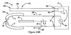 図24Bは、双極構成100にある電気手術デバイス2、および動作アーム6間に流れる電力68を示す。信号がポート160を通ってジェネレータ8内の内部スイッチおよび/または中央処理装置(CPU)74に送信されるように、起動回路300上の起動ボタン302は第2のスイッチ状態312にあり、信号がポート160を通ってジェネレータ8内の内部スイッチおよび/または中央処理装置(CPU)74に送信される。内部スイッチおよび/またはCPU74は電源64を起動してハンドピース120に電力を供給させる。電力は、電力コネクタ52を通って、方向320のようにスイッチ60を通って流れ、動作アーム6に供給され、動作アーム6間に電力68が流れる。ブレード電極26のスイッチ60は切断されており、ブレード電極26には電力が供給されない。  FIG. 24B shows the