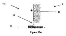 図19Aおよび図19Bは、単極構成102にある電気手術デバイス2を示す。図19Aは、接地パッド66への電力流68を有するブレード電極26を示す。電力68は、ブレード電極26から組織200(図示せず)を通って接地パッド66へ流れる。  19A and 19B show the