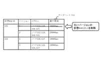 図5は、データベース103に格納された仮想ネットワーク情報の一例を示す図である。図5の例では、仮想ネットワーク131と、仮想ネットワーク132との2つの仮想ネットワークが設定されている状態を示している。図5の例では、仮想ネットワーク131は、ネットワーク120のノード112、113、114、115によって構成され、その最大帯域(上限転送レート)は100Mbpsである。また、バージョンフィールドには、「1」が設定されている。同様に、仮想ネットワーク132は、ネットワーク120のノード116、117によって構成され、その最大帯域(上限転送レート)は100Mbpsである。また、バージョンフィールドには、「1」が設定されている。本実施形態では、このバージョン数をノードに設定する制御情報の優先度として用い、バージョン数が大きいものを優先度が高いものとして取り扱う。従って、データベース103は、制御情報に付与される優先度と、仮想ネットワークのバージョンと対応付けて管理する仮想ネットワーク情報管理手段としても機能する。  FIG. 5 is a diagram illustrating an example of virtual network information stored in the