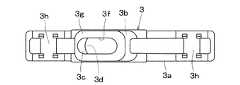 貫通孔3cの下部には、接触部3aに面して略矩形状の下開口部3dが形成され、下開口部3dの周囲には低段の凹部3eが設けられている。また、貫通孔3cの上部には上開口部3fが設けられ、上開口部3fを囲むように内方向に張り出す周縁部3gが形成されている。更に、接触部3aの長手方向の両端部には締付バンド2を配置するための溝部3hが設けられている。  A substantially rectangular