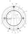 ターンテーブル20の外周の近くに第1同心円Eが設定されている。その内周側に第2同心円Fが設定されている。また、第3同心円Rはターンテーブル20の内周に近く、第2同心円Fの内周側に設定されている。3個のカム車輪(以下、「第1カム車輪」、「第2カム車輪」、「カム車輪」又は単に「車輪」ともいう)24〜26がターンテーブル20の上面29に配設され、上板30の下面39に形成されたカム面91〜93を転動しながら上板30を支承するようにカム機構99が構成されている。また、このカム機構99には、上板30の下面39におけるカム面91〜93以外の平面だけを転動するため、上板30に対して、昇降作用させることなく支承する2個の非カム車輪(以下、単に「車輪」ともいう)27,28も配設されている。  A first concentric circle E is set near the outer periphery of the