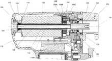 モータ102は、細長いモータ軸106を含み、細長いモータ軸106は、ギヤボックス装置104を介して細長い駆動軸108に連通接続される。図1及び2に示されるように、モータ軸106は、モータ102を通ってギヤボックス装置104へと遠位に延在する。ギヤボックス装置104は、駆動軸108にモータ軸106の回転速度及び回転力を変換及び伝達するように構成される。典型的に、外科用動力工具内で使用するための好適なモータは、比較的小さく、かつ軽量であることを要する。より小さく、より軽く、かつより強力なモータは、より高い速度を要求することが理解されるべきである。ゆえに、モータ102は、所望の出力回転力を得るために、取り付け可能な外科用器具の所望の回転速度より高い回転速度で回転し、ギヤボックス装置104は、モータ軸106の回転速度及び回転力を駆動軸108に変換及び伝達するように使用され得る。例えば、いくつかの実施形態において、モータ軸106は、およそ15,000〜20,000RPMで回転することができる一方で、駆動軸108の所望の回転速度は、およそ3,000RPM(即ち、モータ軸106より5〜6倍遅い)である場合がある。別の方法としては、又は加えて、付加的駆動アタッチメントは、回転速度を外科用器具の所望の回転速度に更に減速し得、回転速度はおよそ1,000RPM以下である場合がある。更に、付加的駆動アタッチメントは、例えばバール等の高速切削器具を駆動するために、回転速度を外科用器具の所望の回転速度に加速し得(例えば15,000RPM)、回転速度は、駆動軸108の回転速度をほぼ超える場合もある。モータ102、モータ軸106、駆動軸108、外科用器具等について上述の回転速度は、外科用装置100の所望の動作特性に基づいて選択され得、ゆえに他の値を有し得ることが理解されるべきである。例えば、駆動軸108の所望の回転速度は、外科用装置100の所望の動作特性に応じて、3,000RPM以上又は未満であり得る。したがって、駆動軸108の所望の回転速度は、3,000RPMに限定されず、これは1つの例示的な所望の回転速度に過ぎない。 The