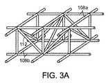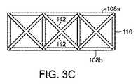図3Aおよび図3Bに示す別の実施形態において、内骨格は、トラス安定化部112を含んで、つぶれ中の充填材料102の傾動を阻止する。トラス安定化部112は、充填材料102がつぶれるときに、上部x−y安定化部108aと下部x−y安定化部108bとを互いに位置合わせした状態で維持する。いくつかの実施形態において、トラス安定化部112は、特定の方向において剛性があり、他の方向では比較的低い剛性があるものとすることができ(例えば、トラス安定化部は曲げることができる)、特定方向につぶれるのを促進する。図3Cは、「x」形パターンのトラス安定化部112を有する代替的実施形態を示す。  In another embodiment shown in FIGS. 3A and 3B, the endoskeleton includes a
