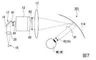 ここで、ヘッドマウントディスプレイにおいて、MEMSミラーの半画角10度の場合、2.5m先で約40インチ、アスペクト16:9相当の虚像サイズに相当する。したがって、さらなる画角が広い高画角化を実現するには光学系により画角を増加(拡げる)必要がある。しかしながら、画角と射出瞳の大きさとには相反する関係があり、例えば、画角を拡げると射出瞳の大きさが小さくなってしまう。 Here, in a head mounted display, when the half angle of view of the MEMS mirror is 10 degrees, it corresponds to a virtual image size equivalent to about 40 inches, aspect 16: 9 at 2.5 m ahead. Therefore, it is necessary to increase (spread) the angle of view by the optical system in order to realize a further wide angle of view with a wider angle of view. However, there is a contradictory relationship between the angle of view and the size of the exit pupil. For example, when the angle of view is expanded, the size of the exit pupil becomes smaller.