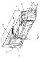 レセプタクルアセンブリ10は、上壁31a、2つの側壁31b、および後壁31cを含む。遮蔽性能を向上するために、底壁31dも提供され得る。ハウジング50は、ケージ内に位置付けられ、ウェハアレイ40を支持する。ハウジング50は、突起60を含み、カードスロット62は、突起60内に提供される。カードスロット62は、パドルカード95と係合し、パドルカード95をカードスロット62の片側へ付勢するように構成される付勢要素68を含む。これは、カードスロットと相対したパドルカード95の制御を可能にし、さもなければパドルカード95上のパッドの位置対カードスロット62内に提供される接触部の位置と関連していたであろう様々な公差を除去する。絶縁性樹脂で形成され得るハウジング50は、さらなる冷却を可能にする空気流路52をさらに含み、ハウジング50にスナップ留めされ、ウェハアレイ40を適所に固定するのに役立つ背面支持54を有し得る。  The